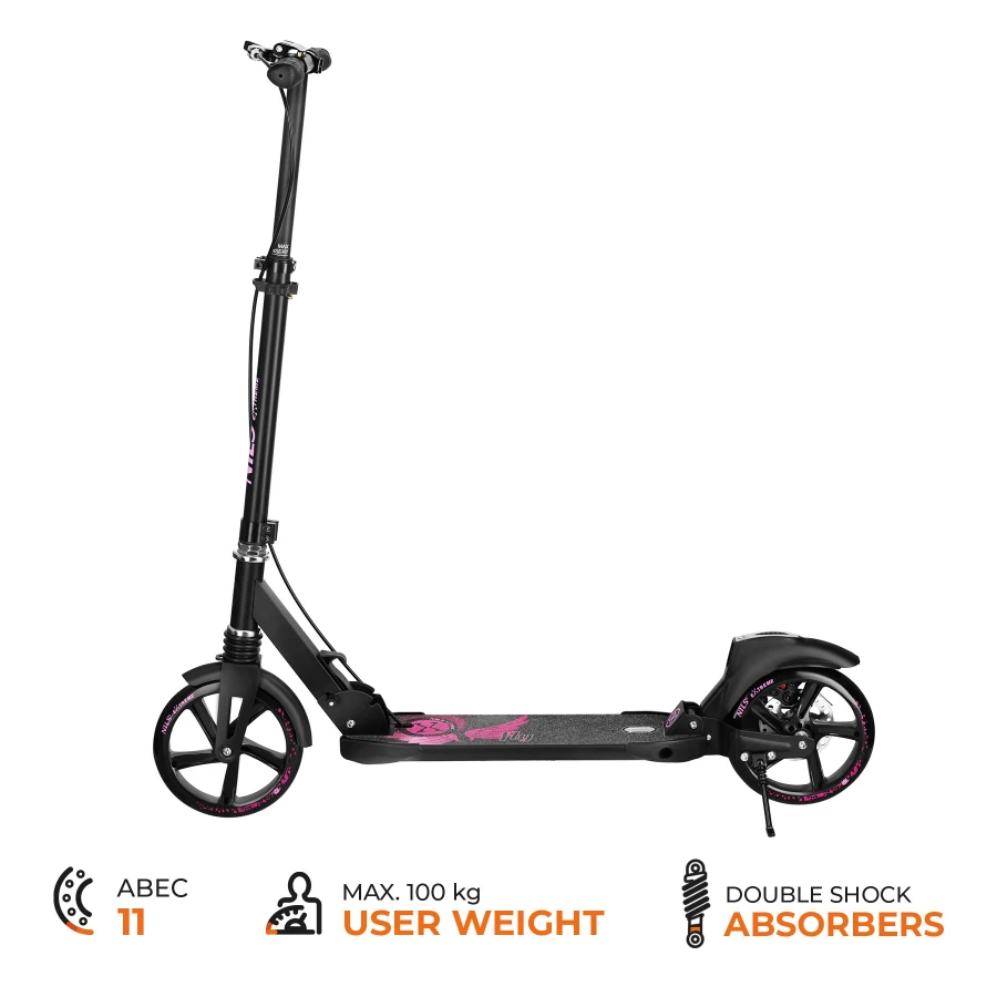 Miękkie, gumowe rączki poprawiają komfort chwytu, a łożyska ABEC-11 odpowiadają za płynne toczenie i spokojną, stabilną jazdę. Składana konstrukcja umożliwia szybkie złożenie hulajnogi, co ułatwia transport i przechowywanie.
